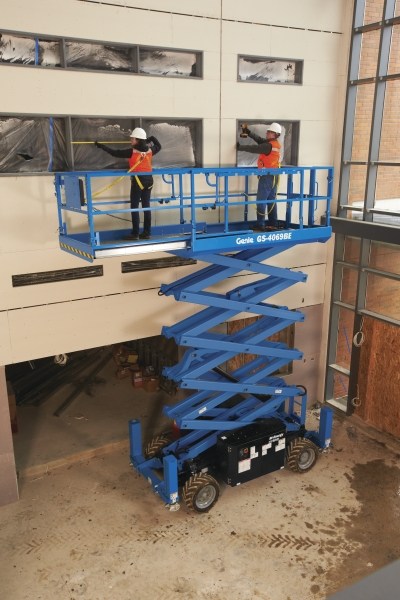 The only 40-ft full drive height unit in its class, the Genie® GS™-4069 RT rough terrain scissor lift features four-wheel drive and positive traction control, offering up to 40% gradeability when driving on slopes — making it ideal for use on demanding outdoor worksites.